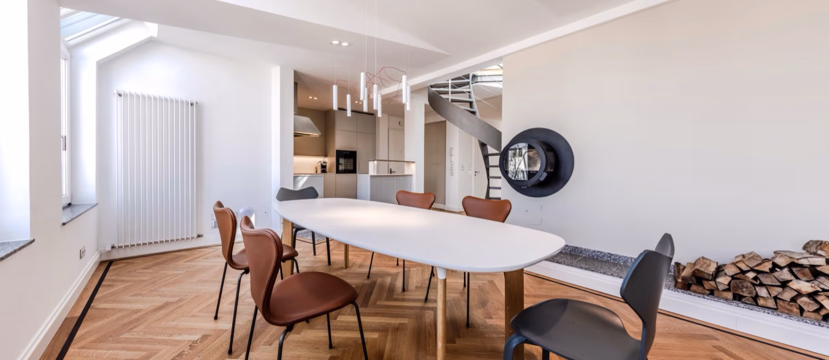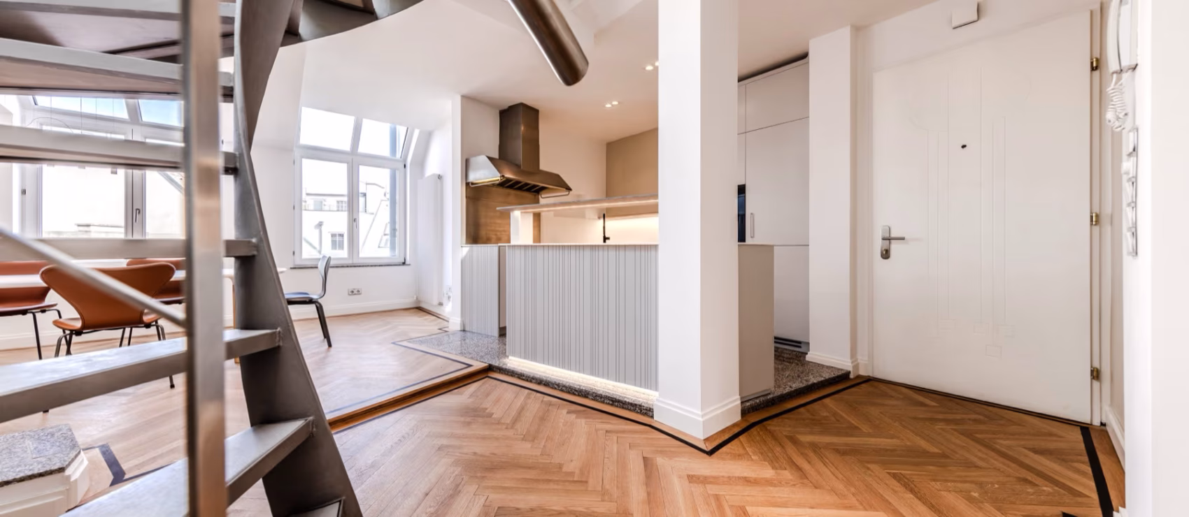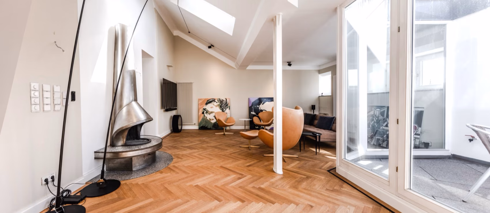 Diese Dachgeschosswohnung ist ein Rückzugsort mit architektonischem Anspruch. Sie liegt in einem der begehrtesten Wiener Bezirke – unmittelbar hinter der Votivkirche – und bietet auf 170 m² Wohnfläche ein Zusammenspiel aus Großzügigkeit, Ruhe und architektonischer Komposition.